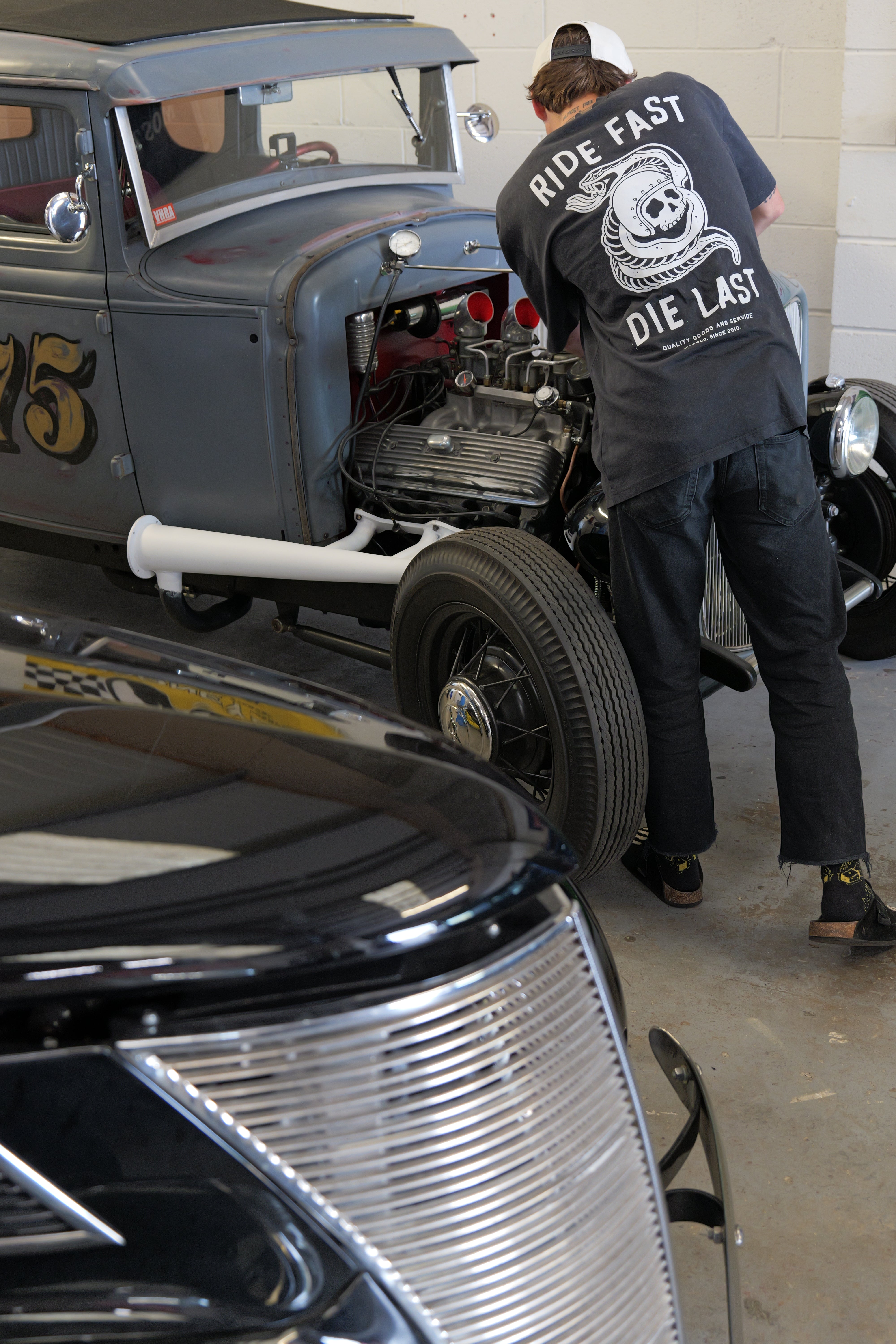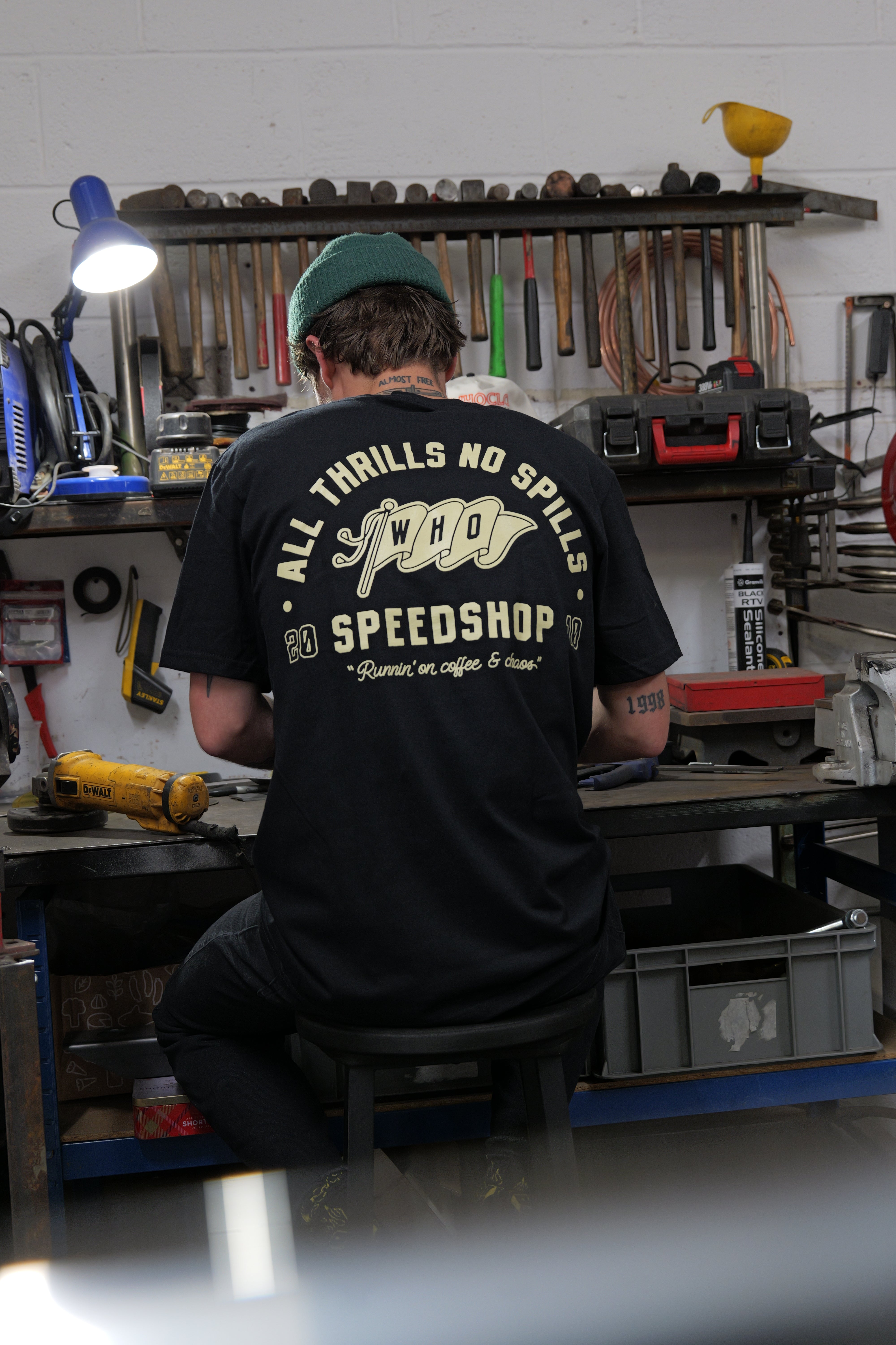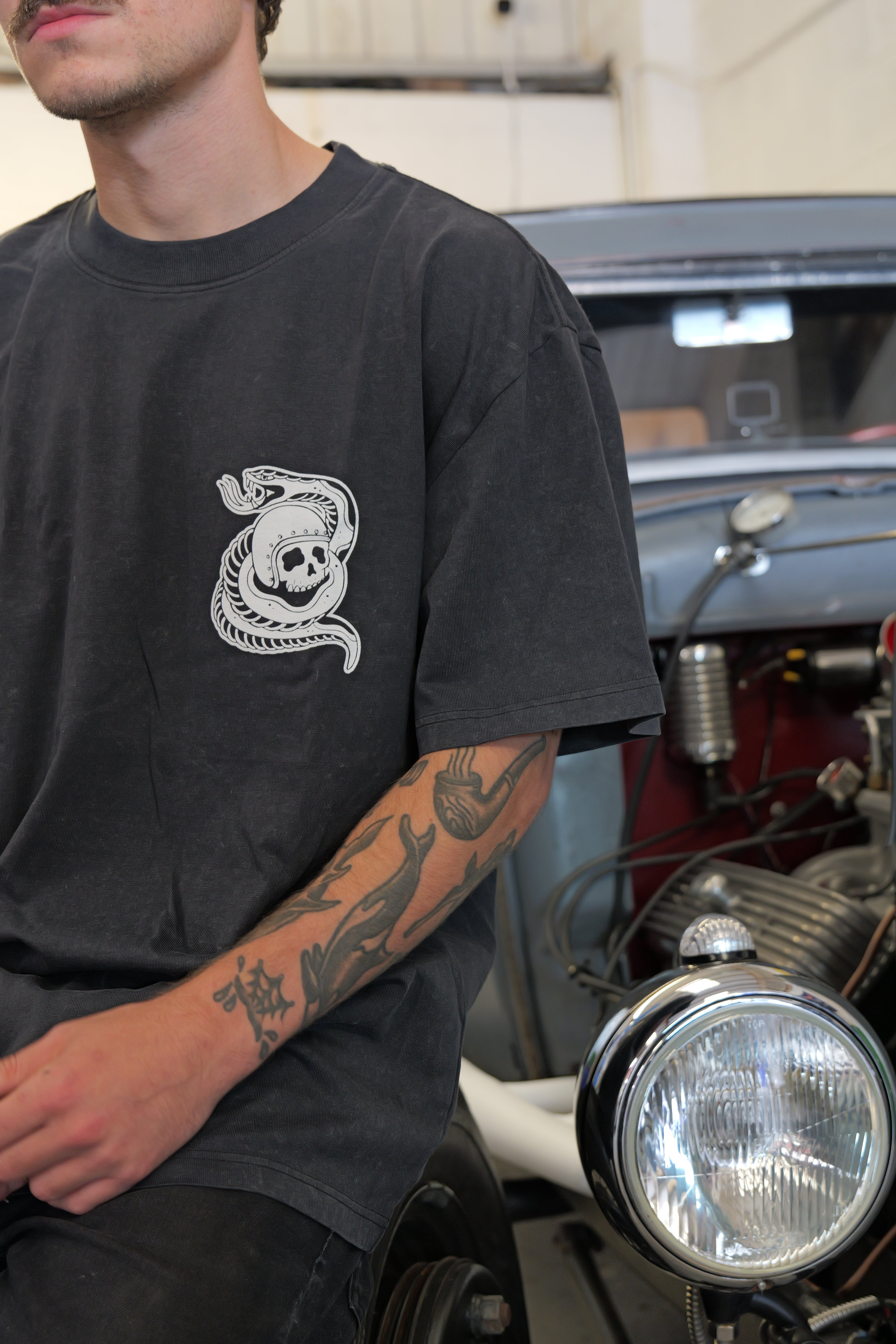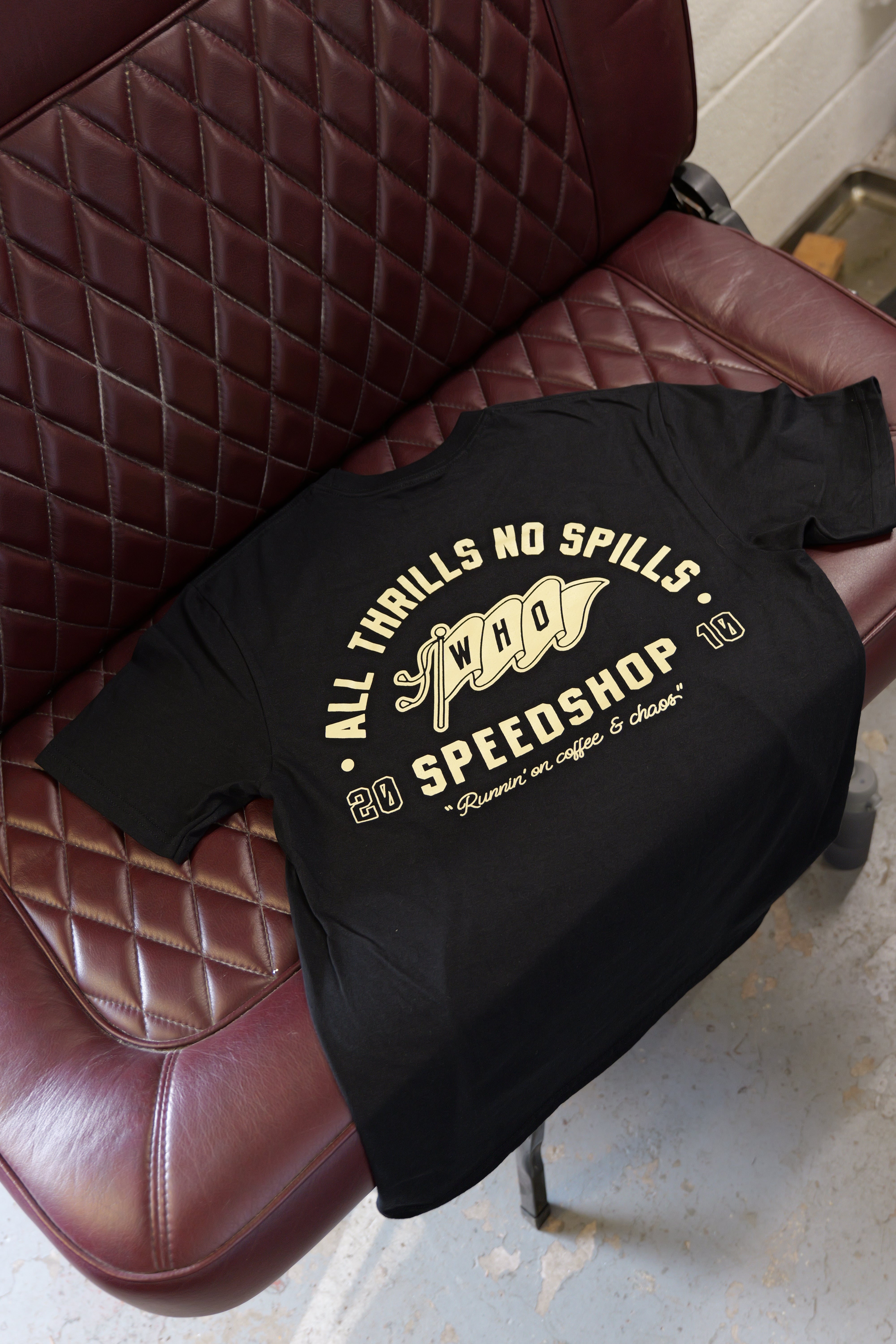 All thrills, no spills - Hand-drawn, printed, and finished in-house by us built from our own love of cars and motorcycles. Limited numbers, made to be worn hard. Chaos in the details, quality over quantity..